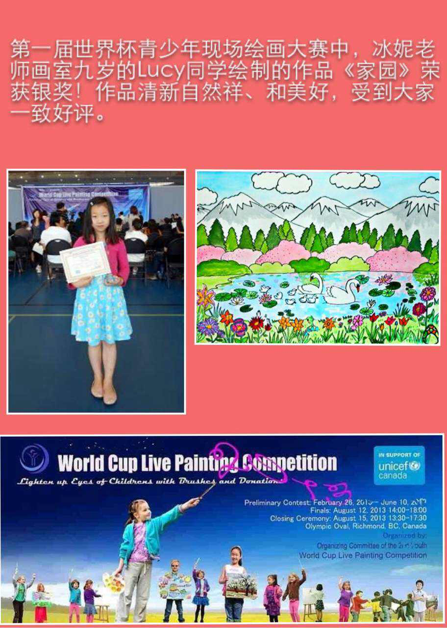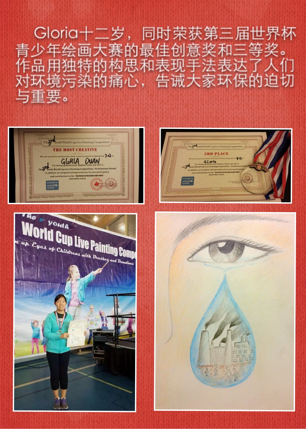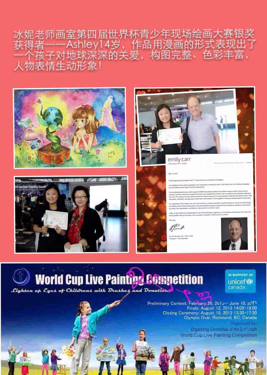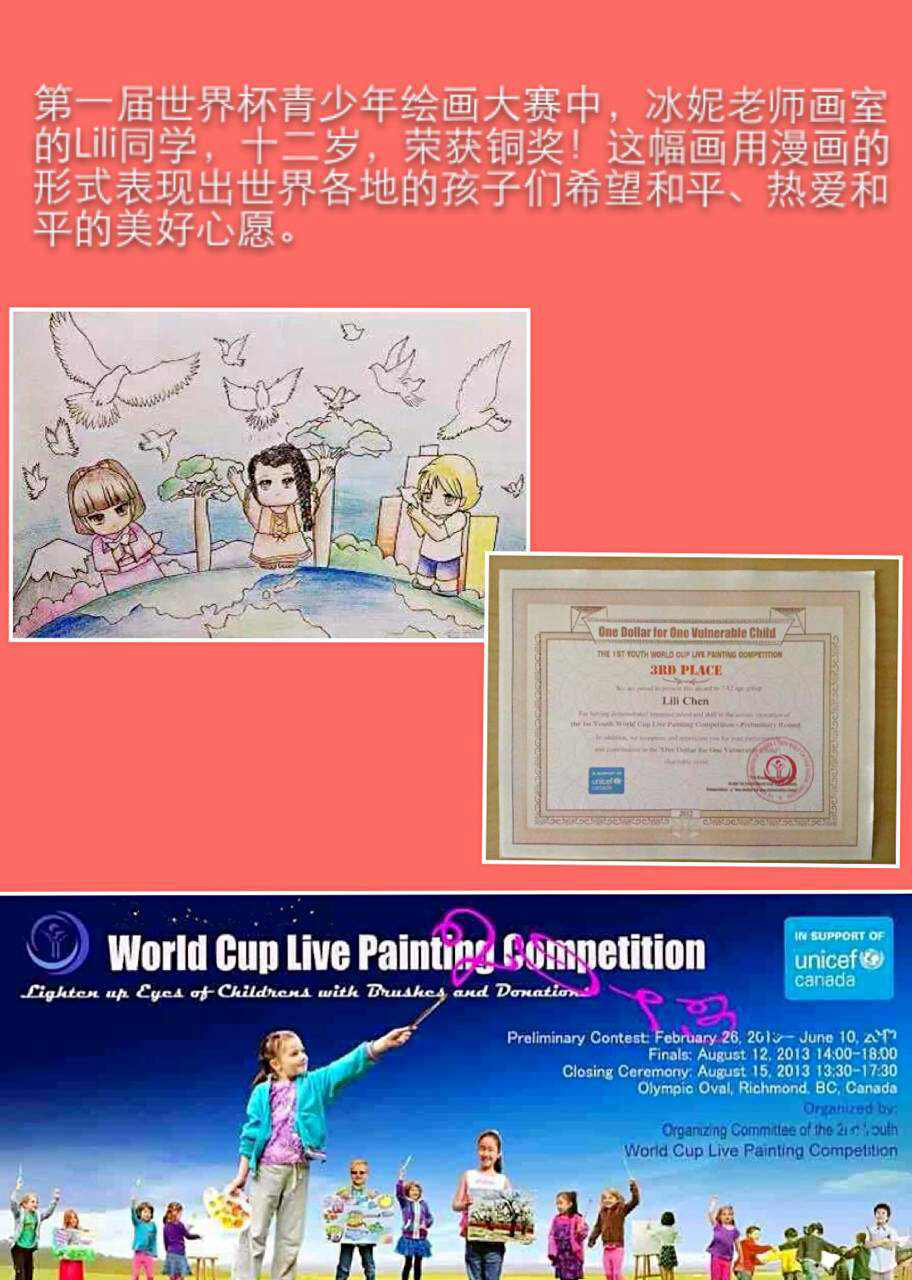 学生在各种绘画大赛中获奖的奖杯奖牌奖状和照片