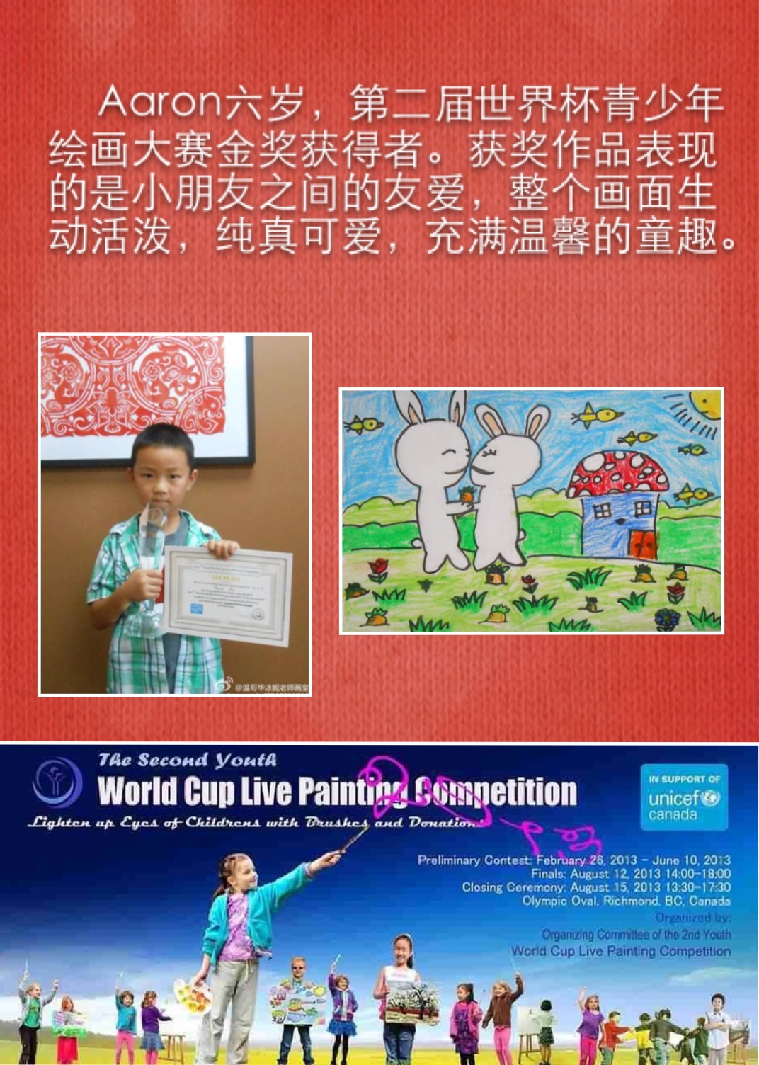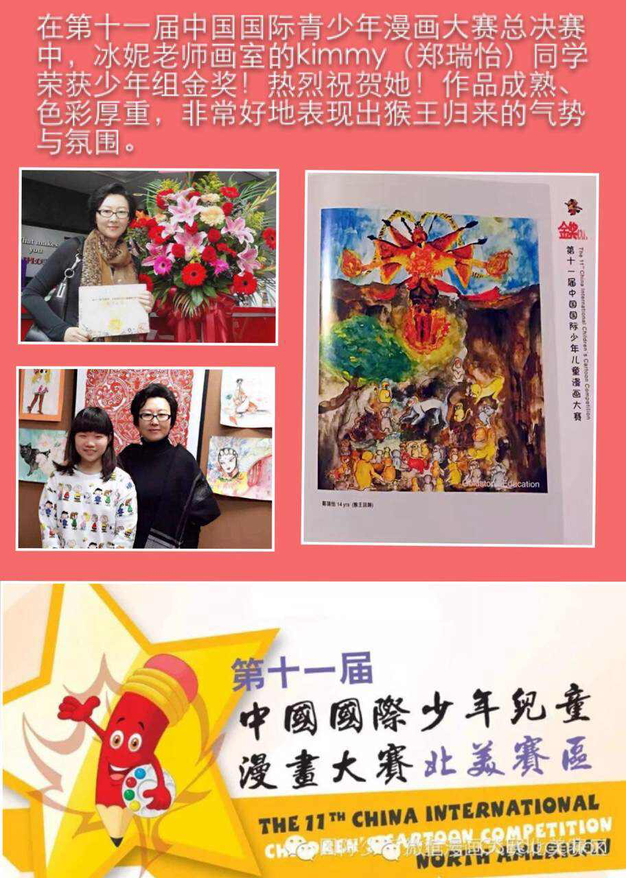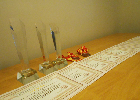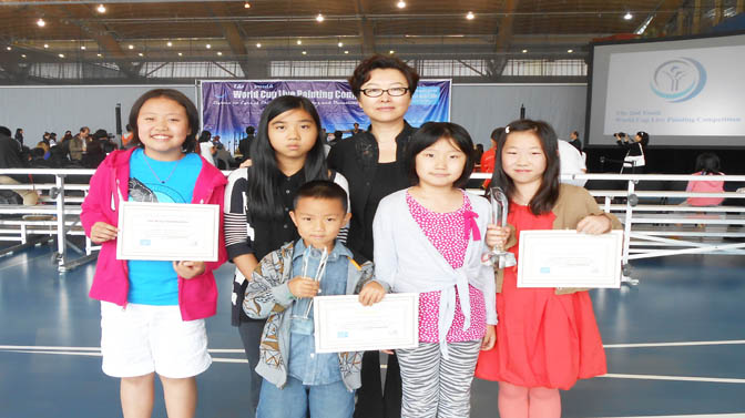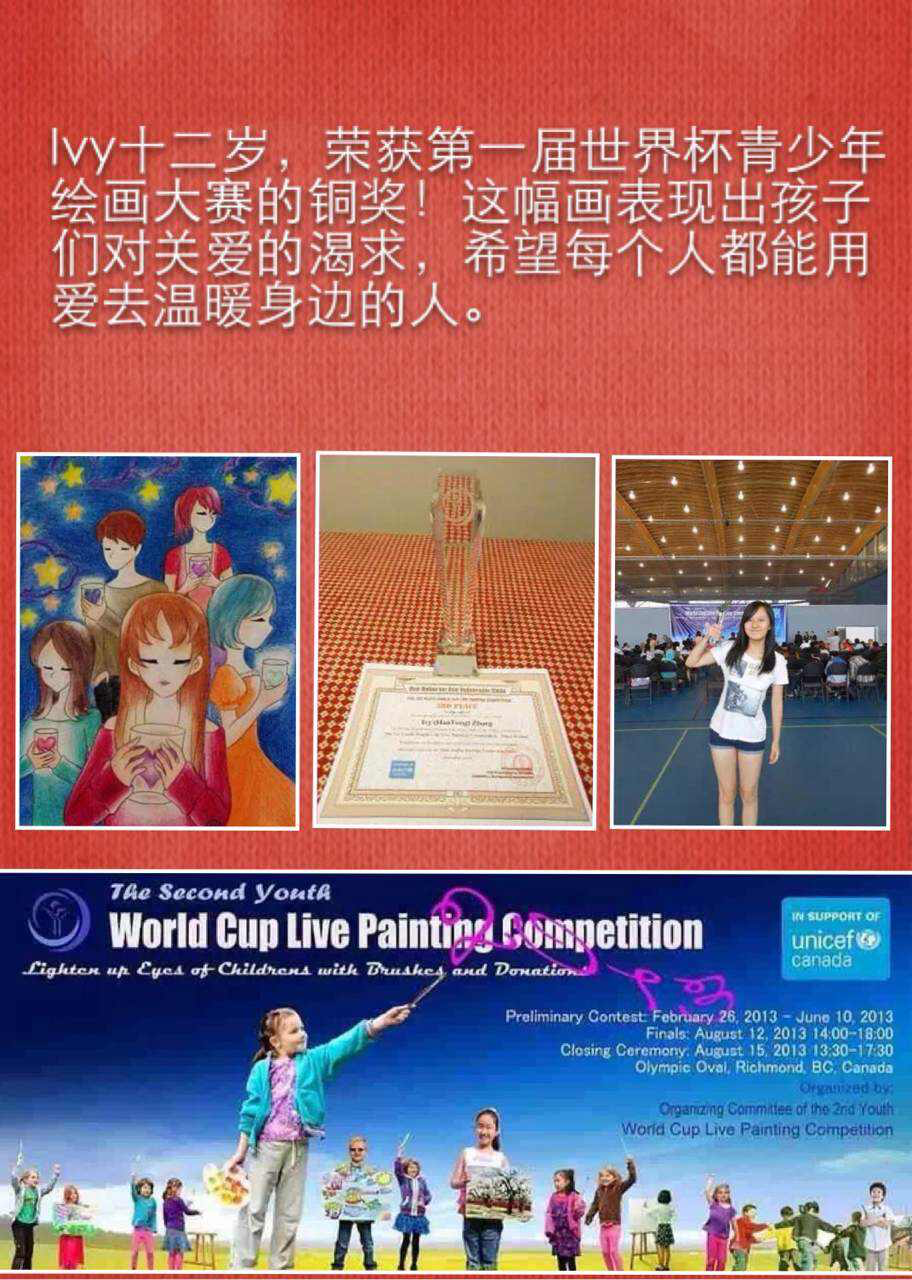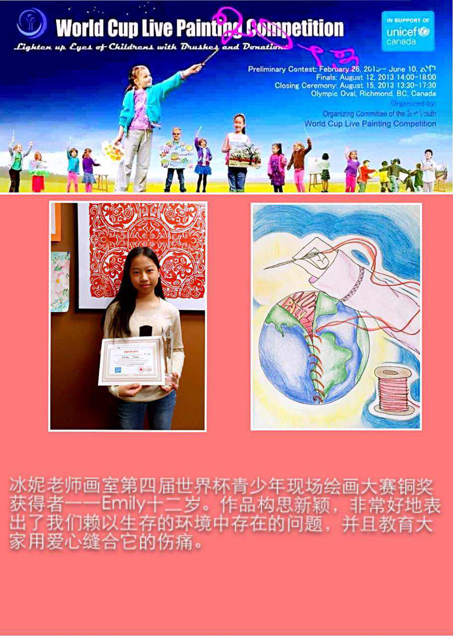 学生在各种绘画大赛中获奖的奖杯奖牌奖状和照片