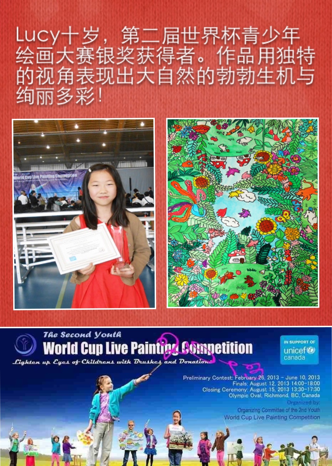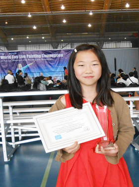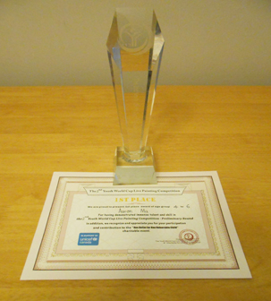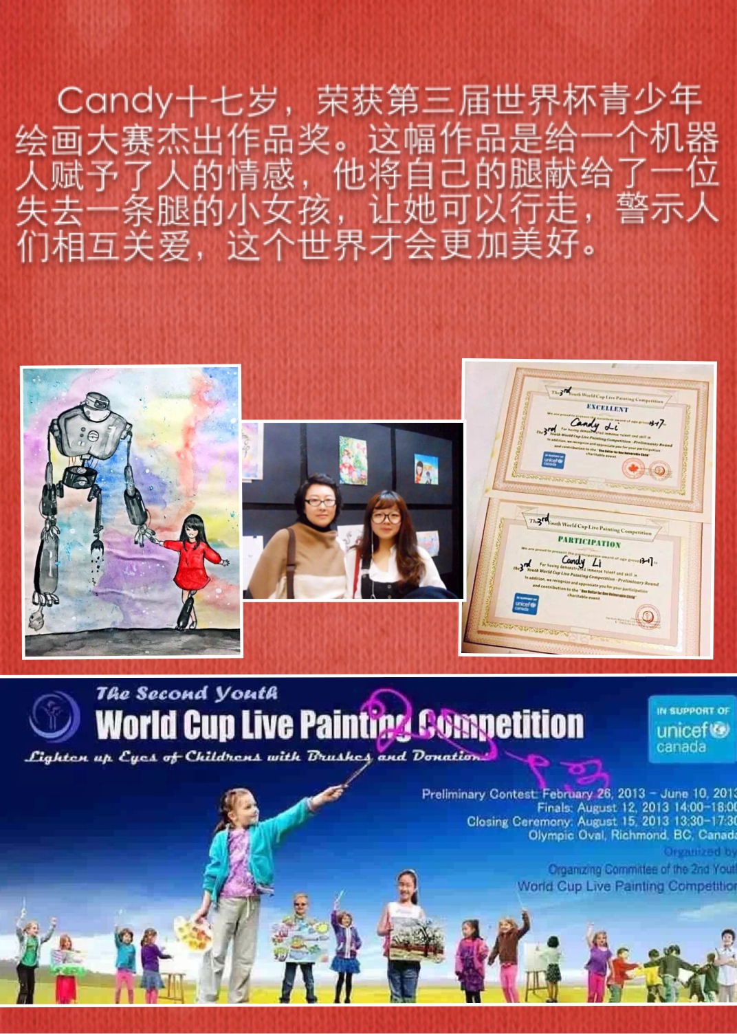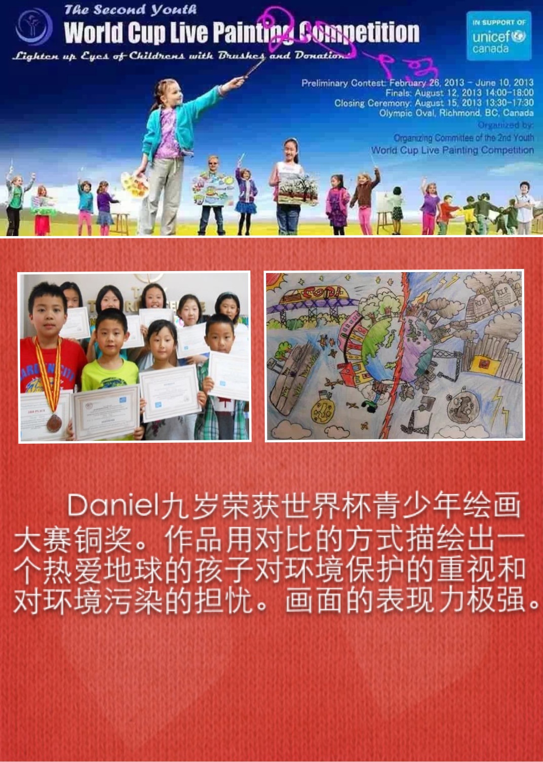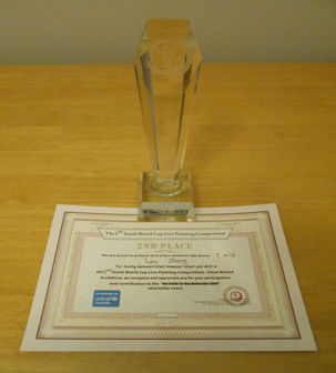 学生在各种绘画大赛中获奖的奖杯奖牌奖状和照片