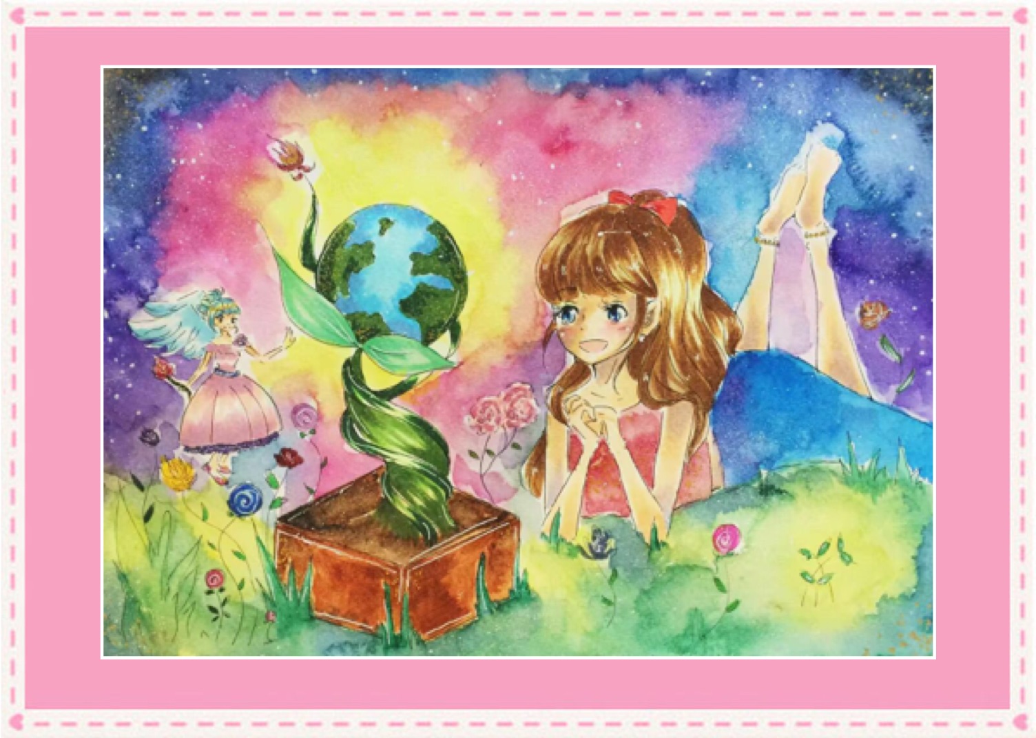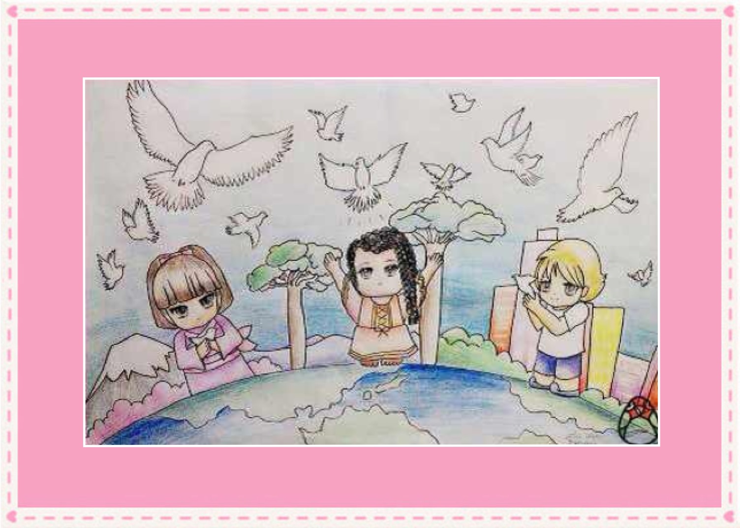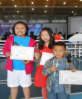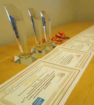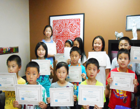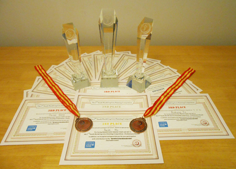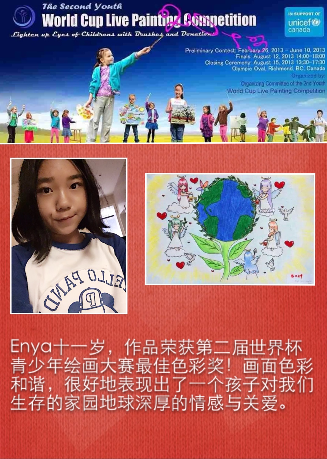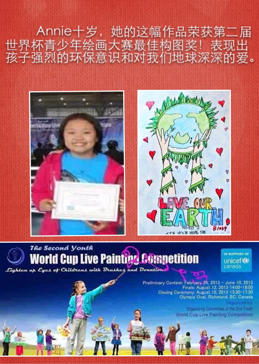 学生在各种绘画大赛中获奖的奖杯奖牌奖状和照片