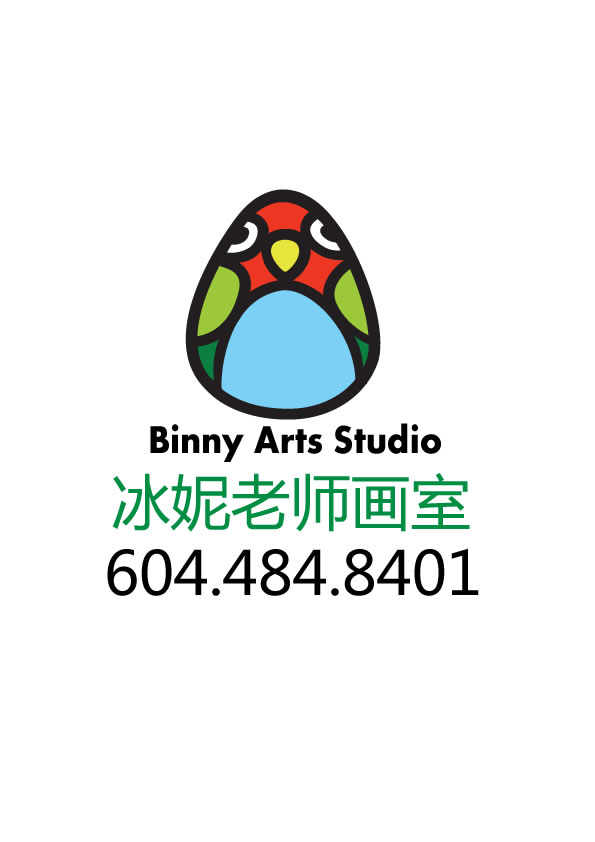 画室标志,蛋形和小鸟的图案代表启蒙与教育,其中有B和N为Binny的含义,各种色彩代表美术。
