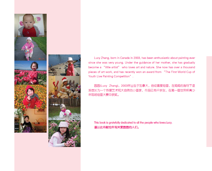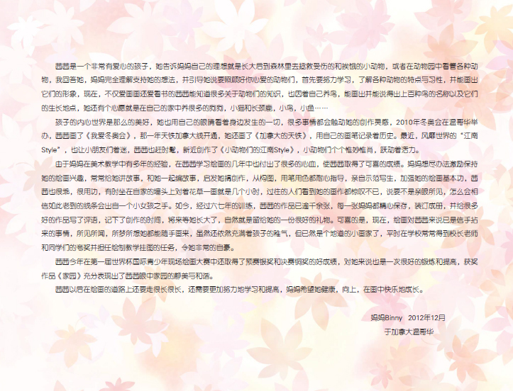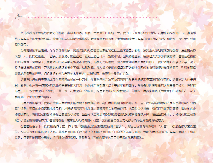 正值美好的人间四月天,冰妮老师的女儿——茜茜的第一本画册出版了。画册名为《茜茜画中成长记》,收集了茜茜从两岁到九岁的一百多幅经典画作,记录了茜茜的成长过程以及冰妮老师怎样教授培养她学习绘画的经过,也是对茜茜的一个阶段性的总结。